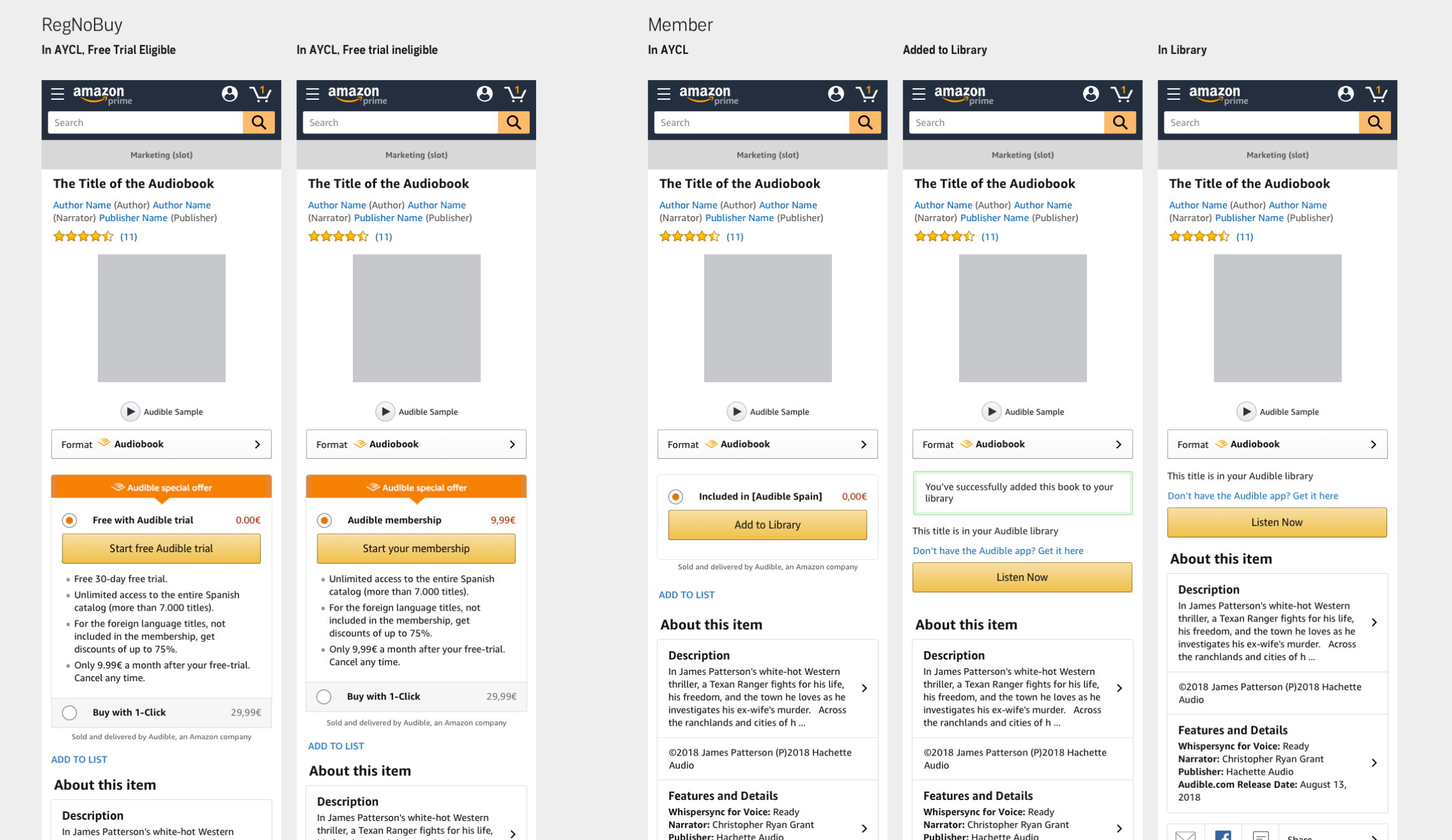 Through working with our international partners and conducting many rounds of research, we tried to answer questions such as What’s important to our listeners in Spain? How will basic design components have to change when the copy is suddenly twice as long in German? Our research uncovered a world of unique & bespoke ideas/ requests/ behaviors/etc. that were crucial to the design for each marketplace. After establishing marketplace specific considerations for Audible Spain, we produced documentation and designs for every part of the experience that would deviate from the business model changes in happening the US.